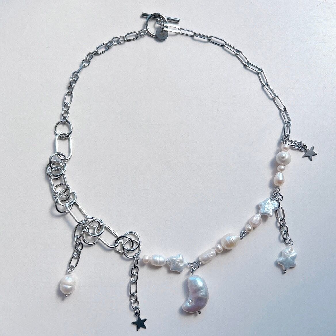 しっかりとしたボリュームのあるチェーンと華奢なチェーンを組み合わせたものに、moonモチーフに映えそうな星の淡水パールをあしらいました。
