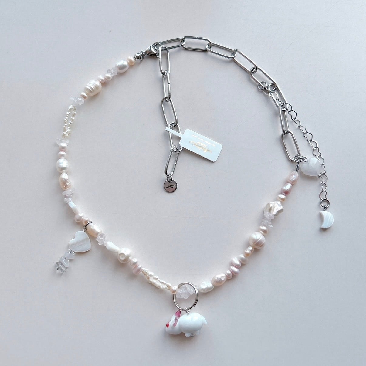 This necklace features a charming glass rabbit accent, paired with freshwater pearls and natural stones for a light, translucent finish.