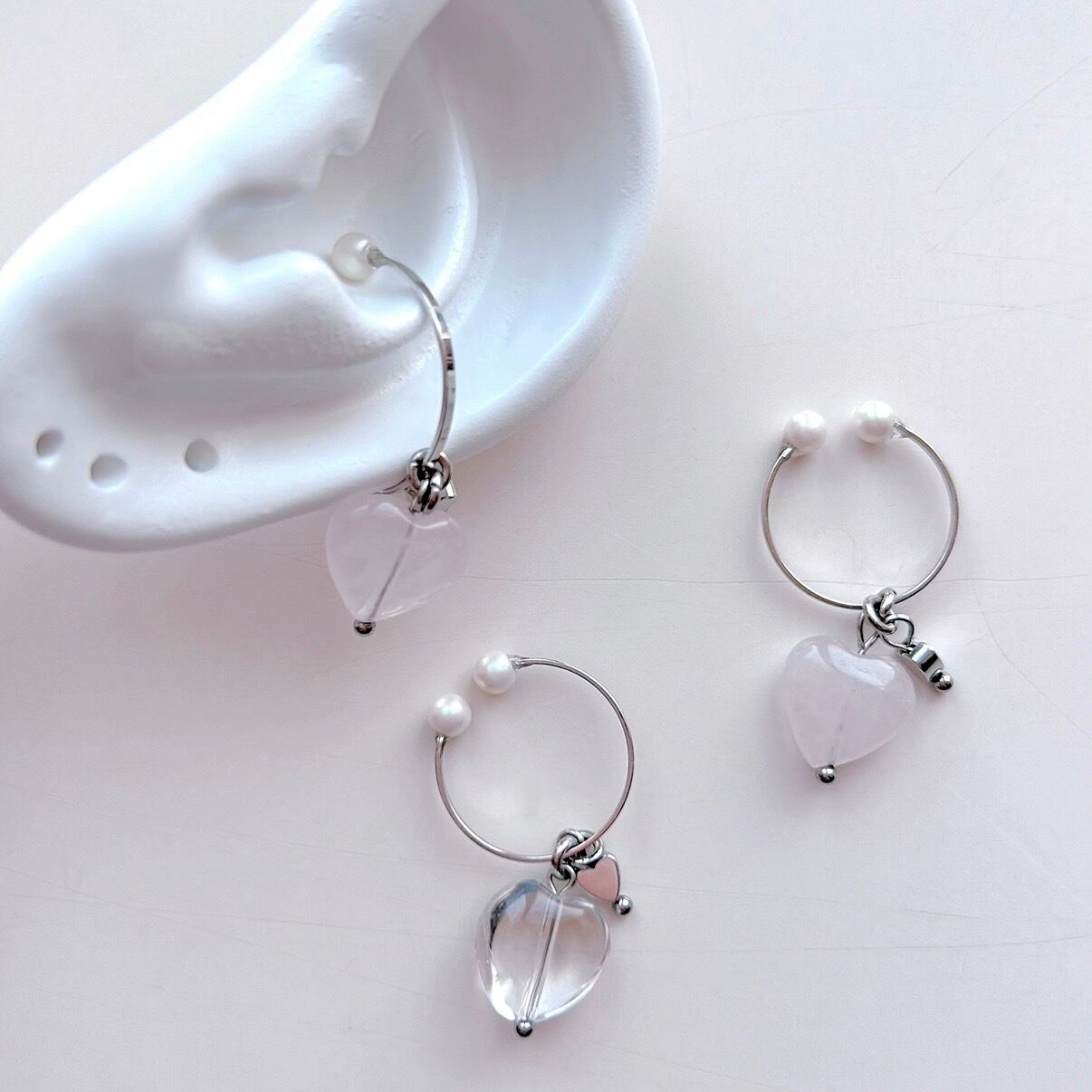 ローズクォーツ、水晶でできたハートのイヤーカフ。プチハートもチラッと見えてワンポイントに。