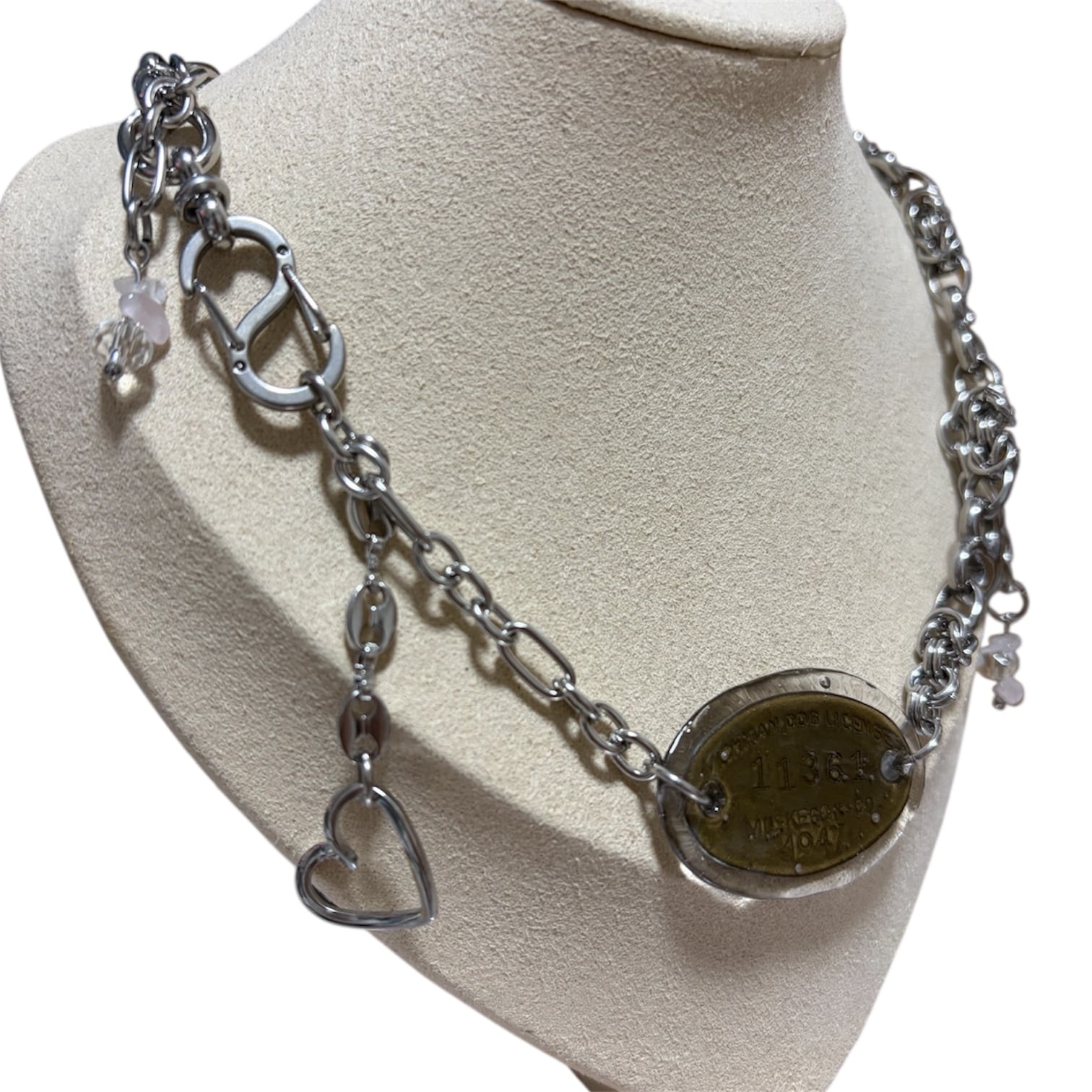 This is an original mimi miroir necklace made with a luxuriously used one-of-a-kind dog tag.