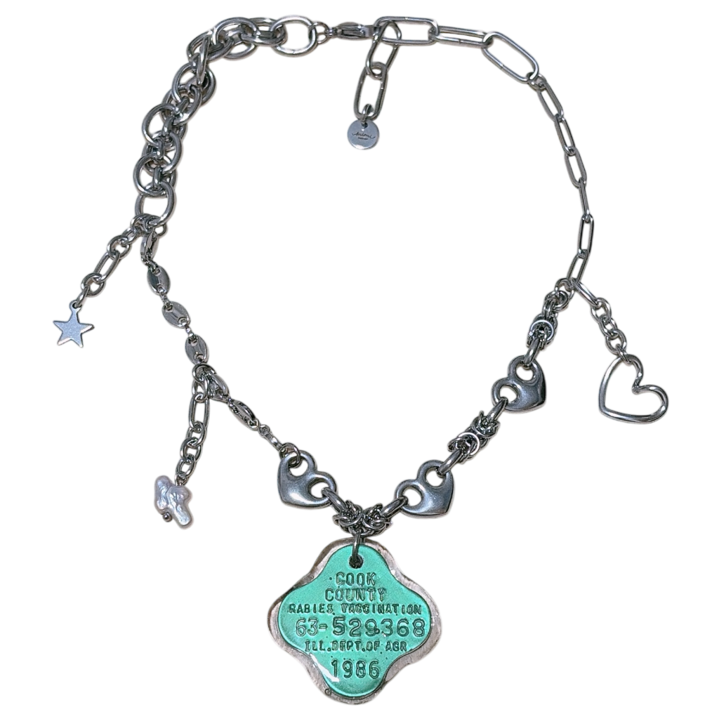 This is an original mimi miroir necklace made with a luxuriously used one-of-a-kind dog tag.