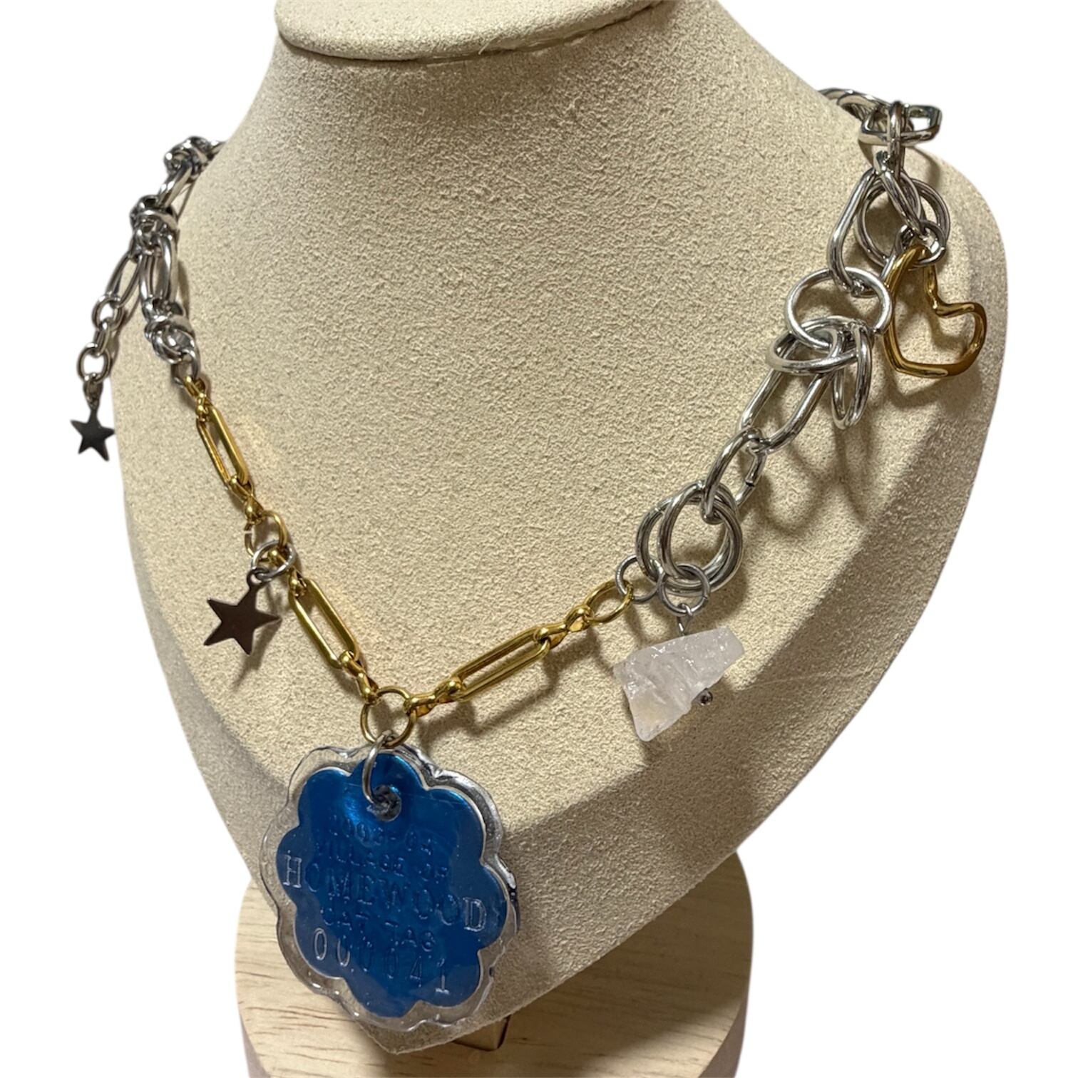 The statement charm adds a sense of exclusivity, while still being easy to wear daily when paired with simple outfits. Multiple types of chains are combined, giving the necklace a beautiful presence from every angle.