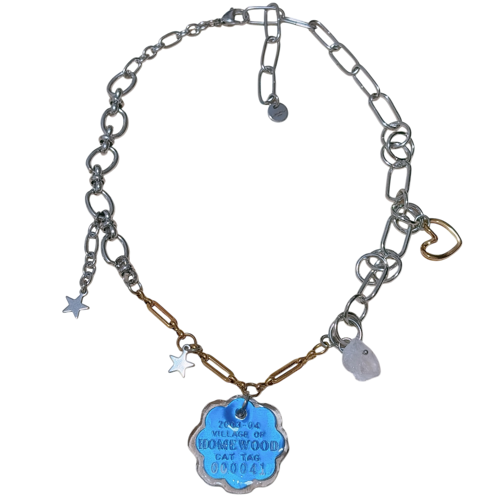 This is an original mimi miroir necklace made with a luxuriously used one-of-a-kind dog tag.