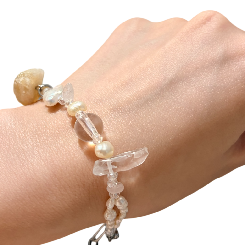 キラキラと輝く水晶やローズクォーツ、シトリン、淡水パールを贅沢に使用したブレスレットです。