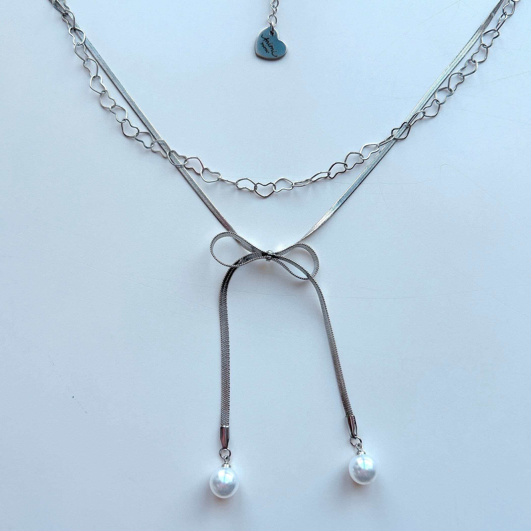 重ね付けしているデザインのribbon×heart chainのネックレス。