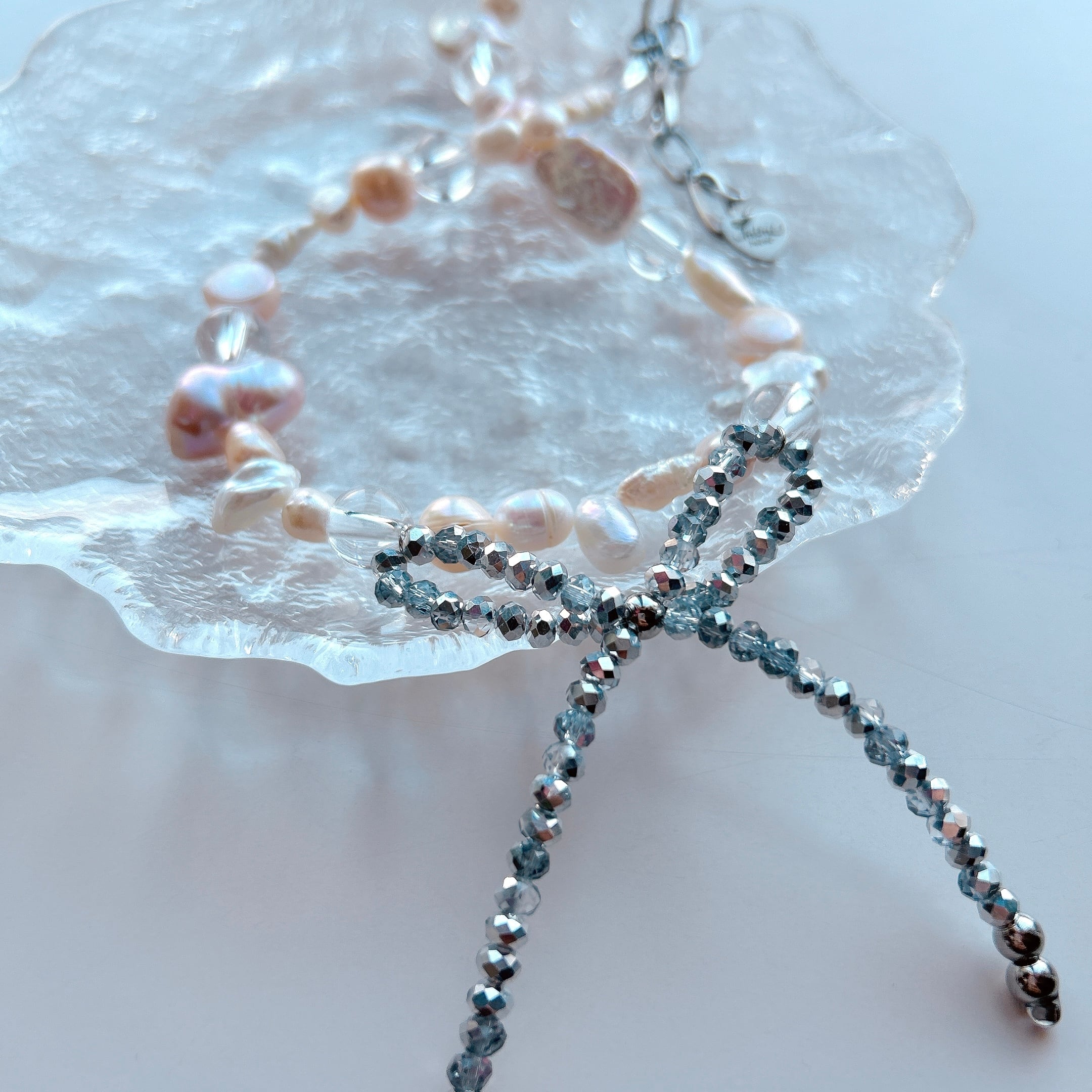 キラキラのガラスビーズとシルバービーズがポイントの大きめリボン。淡水パールが贅沢なチョーカーです。