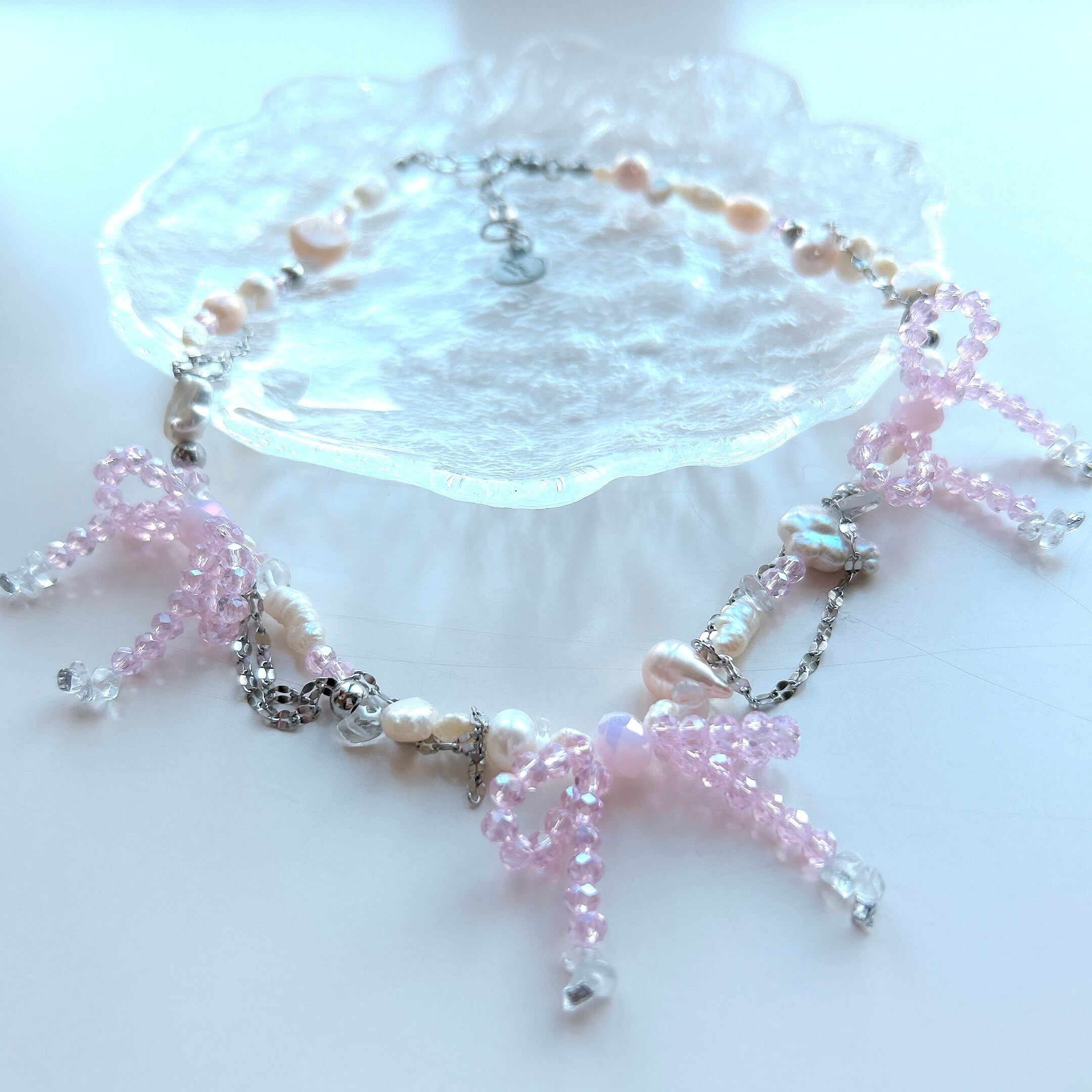 小ぶりなリボンがかわいいボリュームチョーカー。シルバーチェーンが絡まり付いているデザインなので、甘々すぎないデザインが好みの方に♡